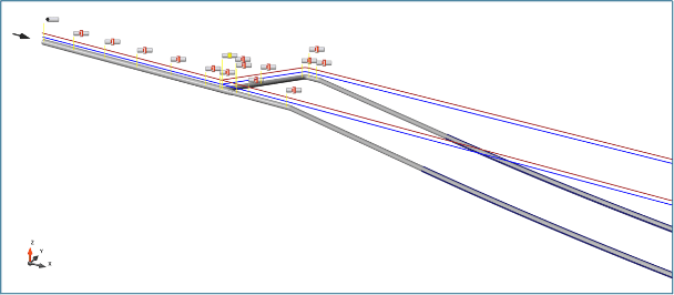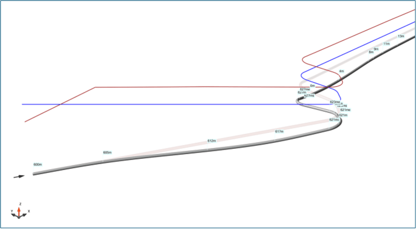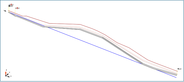 Ground and water level are shown in red and blue, the original and displaced pipeline are shown translucent and gray.